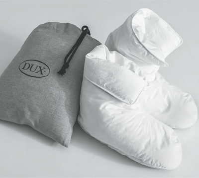 Ylellisen lämpimät DUX-untuvatossut pitävät jalkasi mukavan lämpimänä missä tahansa oletkin.